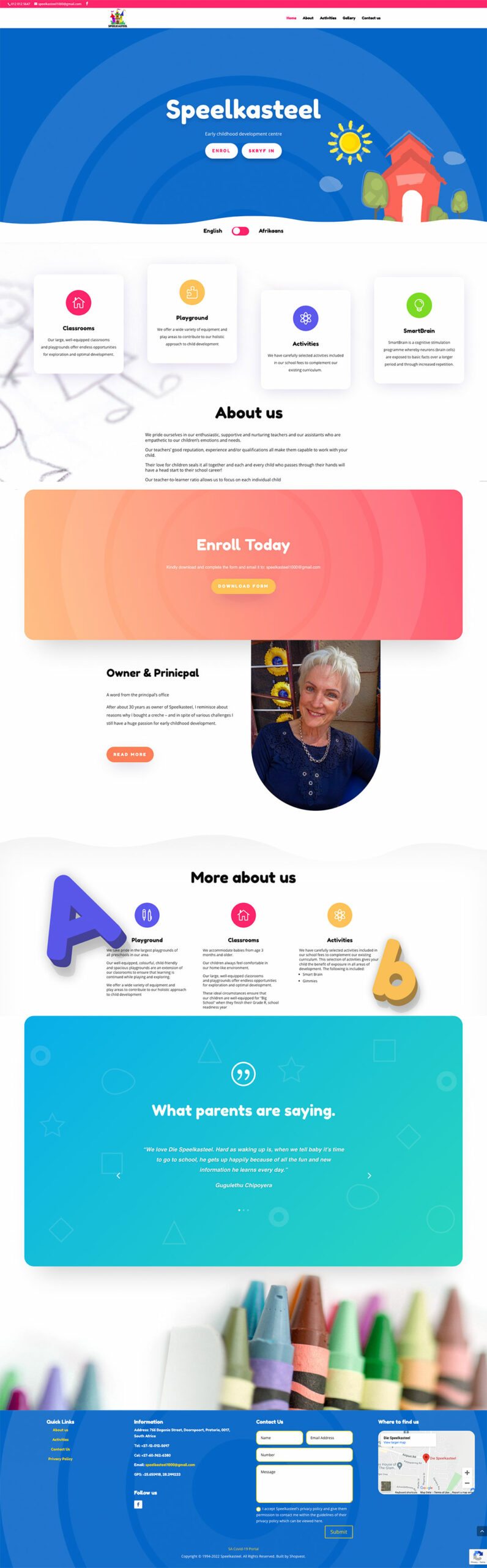 Speelkasteel is an afterschool care facility and early childhood development centre in the Doornpoort area of Pretoria. They are not just a simple afterschool care facility. Speelkasteel implement a program called Smartbrain to help with the early development of your child.